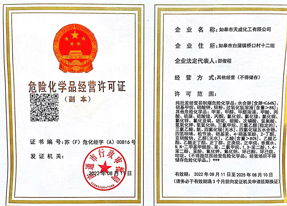 ?      如皋市天成化工有限公司創(chuàng)建于1996年。公司地處于美麗富饒的長江三角洲,座落在古鎮(zhèn)林梓,通揚運河河畔。南瀕長江、西臨204國道,距南通港、飛機場30公里,立體交通發(fā)達。公司經(jīng)營管理規(guī)范,技術(shù)力量雄厚,擁有一批高、中級專業(yè)技術(shù)人才。   公司主要產(chǎn)品為:無水四氯化錫、結(jié)晶四氯化錫、氯化亞錫、三氯乙酸、甲酸銨、苯甲酸銨、對硝基苯酚、對硝基苯甲酸、苯乙醛、癸醛、防腐劑等。產(chǎn)品品質(zhì)優(yōu)異、價格合理,主要銷往北京、上海、廣州、福州、安徽、江西等省市,并出口歐美、東南亞等國家和地區(qū),一直深受廣大新、老用戶的好評。   公司連年被評為“重合同守信用企...[更多內(nèi)容]